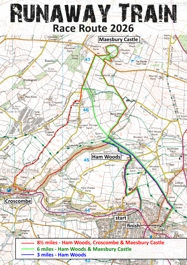 The route is likely to be muddy and stony in places and follows public footpaths and lanes. It is marked with flour along the route and especially at junctions. There will be marshals with first aid kits at Ham Woods quarry, in Croscombe and just below Maesbury Castle. There will not be any road closures in place.